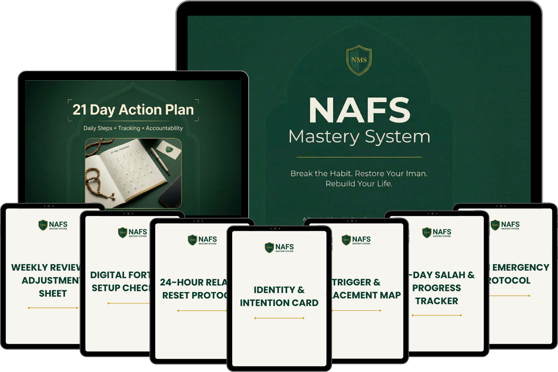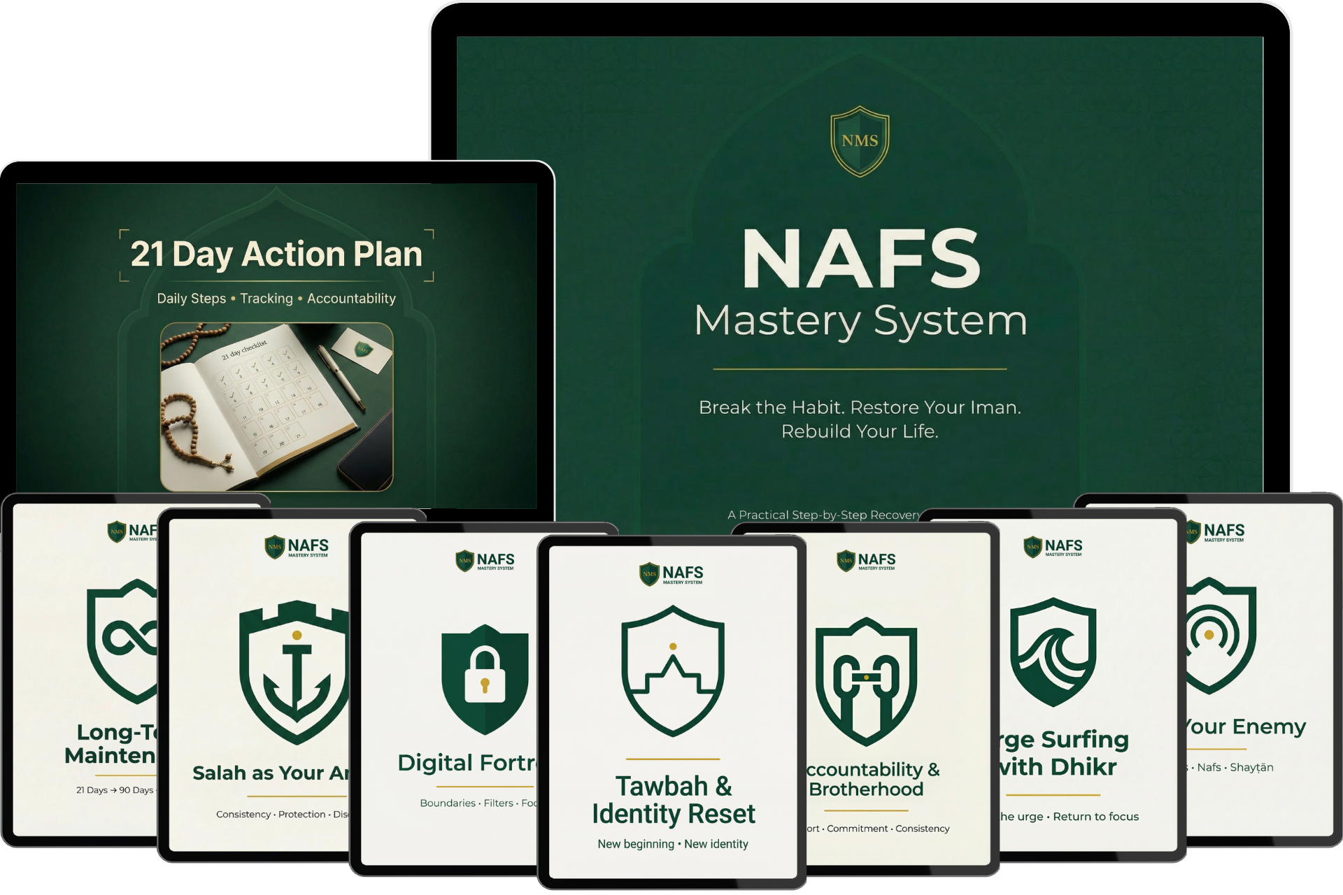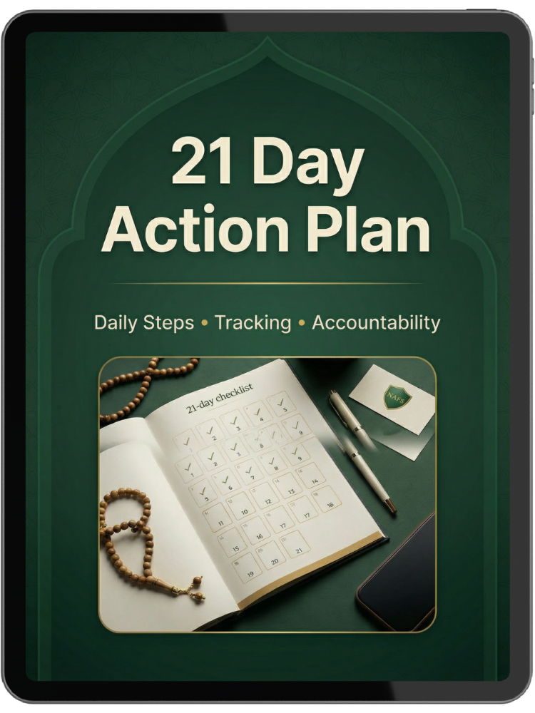 Two complete PDF guides: The 7-Module Core Guide (complete Islamic transformation framework) and The 21-Day Action Plan (daily implementation steps). Instant download. Read on any device. 100% private.