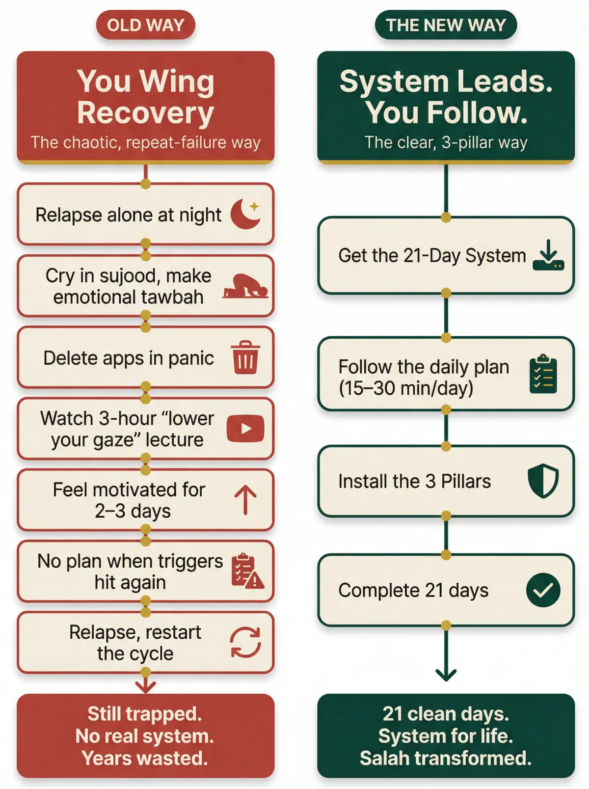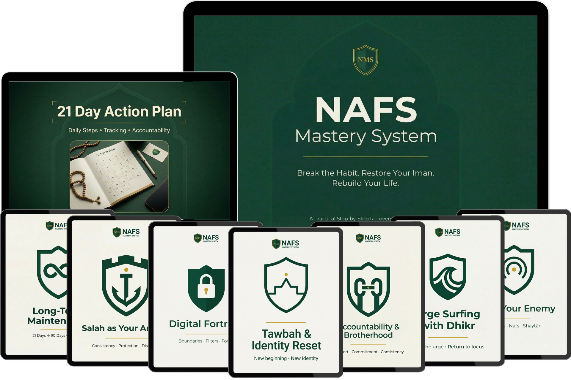 Two complete PDF guides: The 7-Module Core Guide (complete Islamic recovery framework) and The 21-Day Action Plan (daily implementation steps). Instant download. Read on any device. 100% private.
