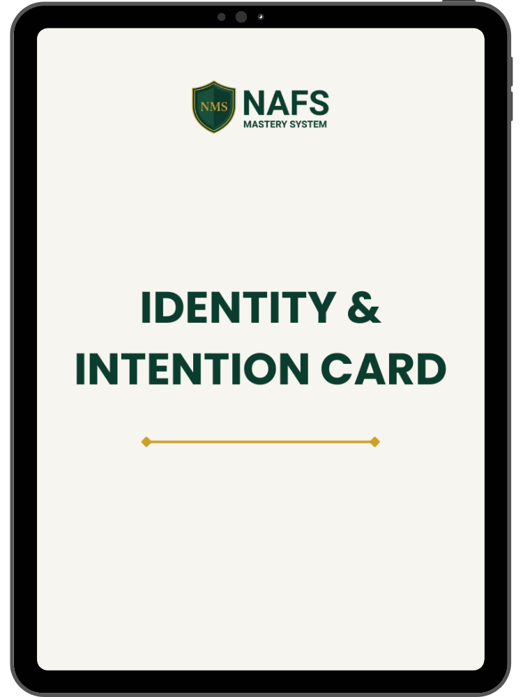 Your personal identity statement, 21-day intention, and daily affirmations written out in one card you'll read each morning after Fajr.