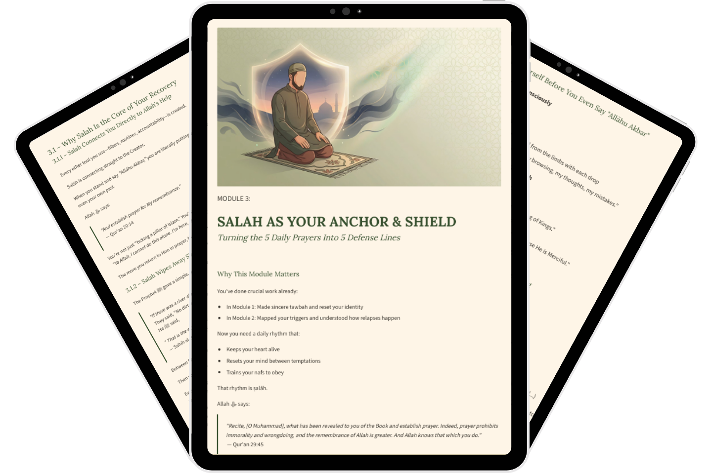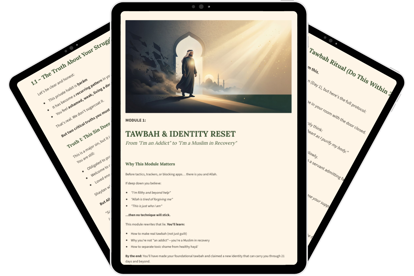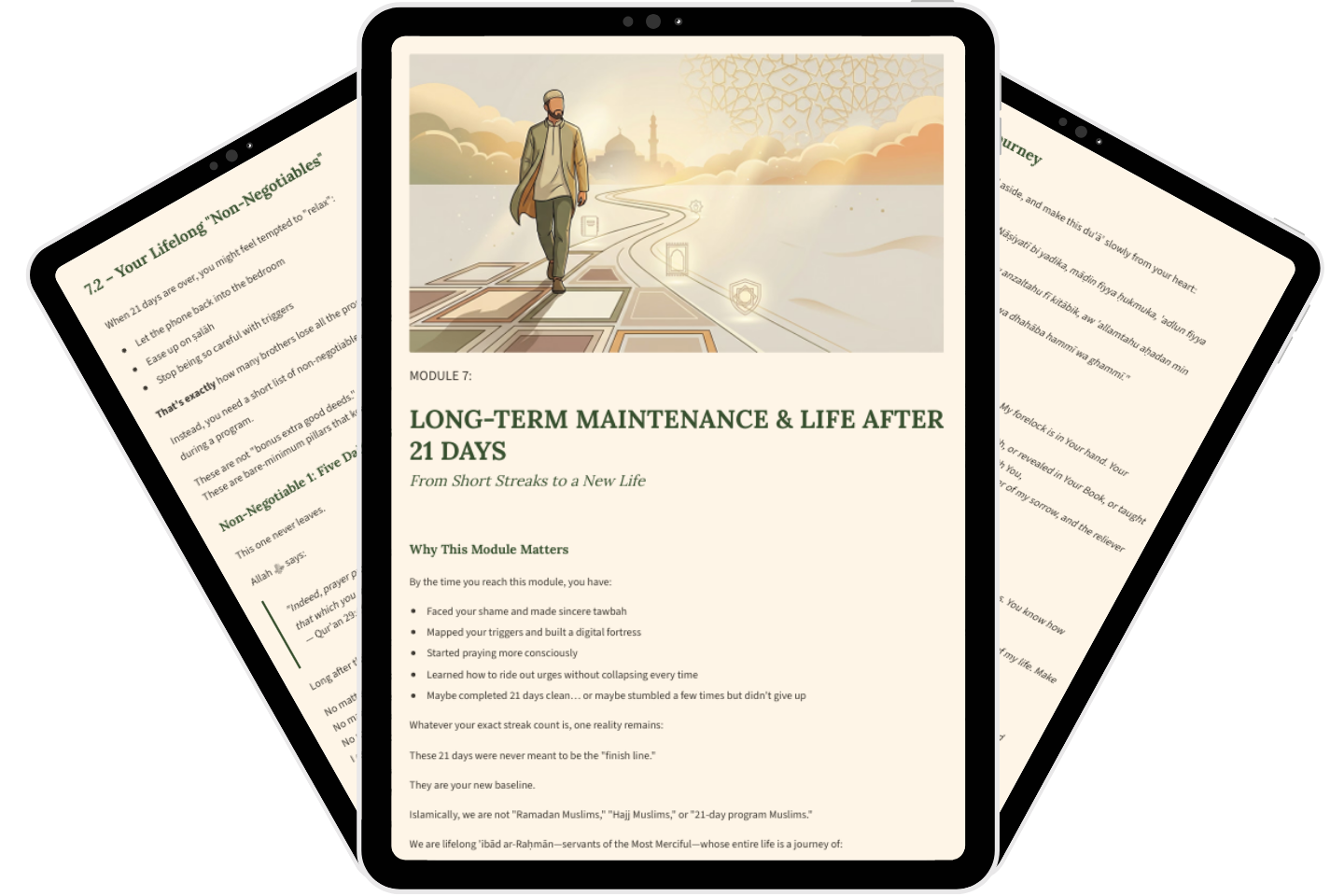 The only approach that works combines three things that have never been put together in a single structured program for Muslim men: Islamic identity transformation + behavioral environment redesign + daily neurological recalibration. Each one alone is insufficient. Together, in a structured 21-day sequence, they close the gap permanently.