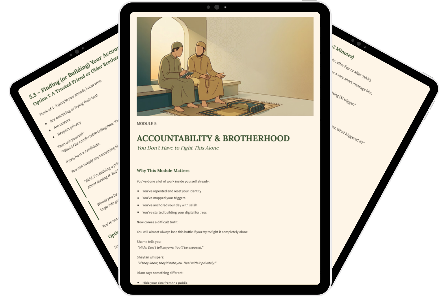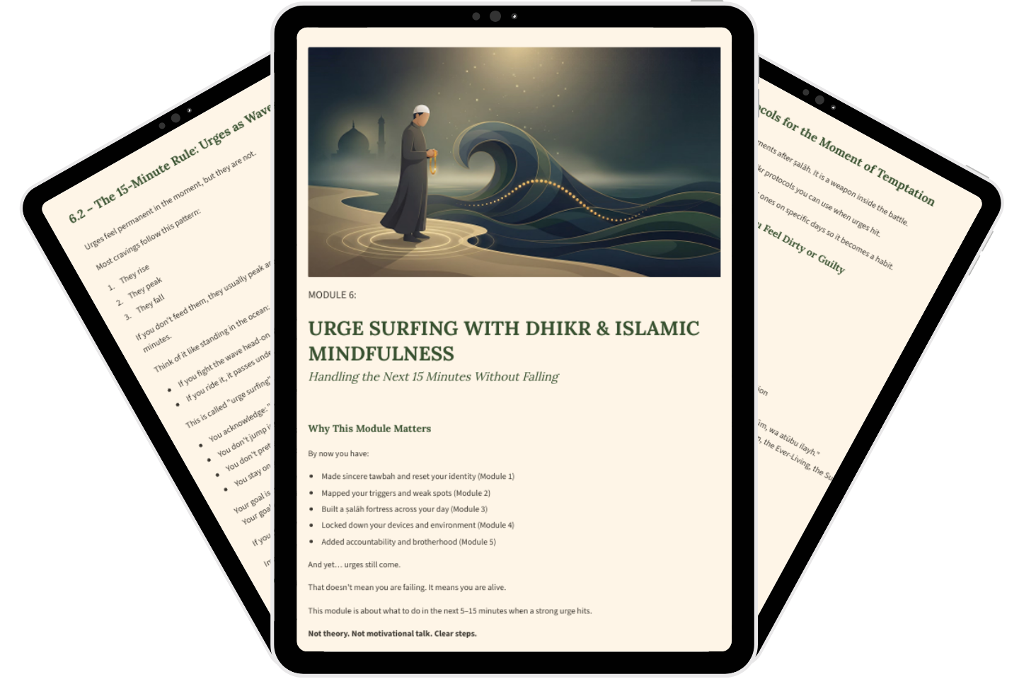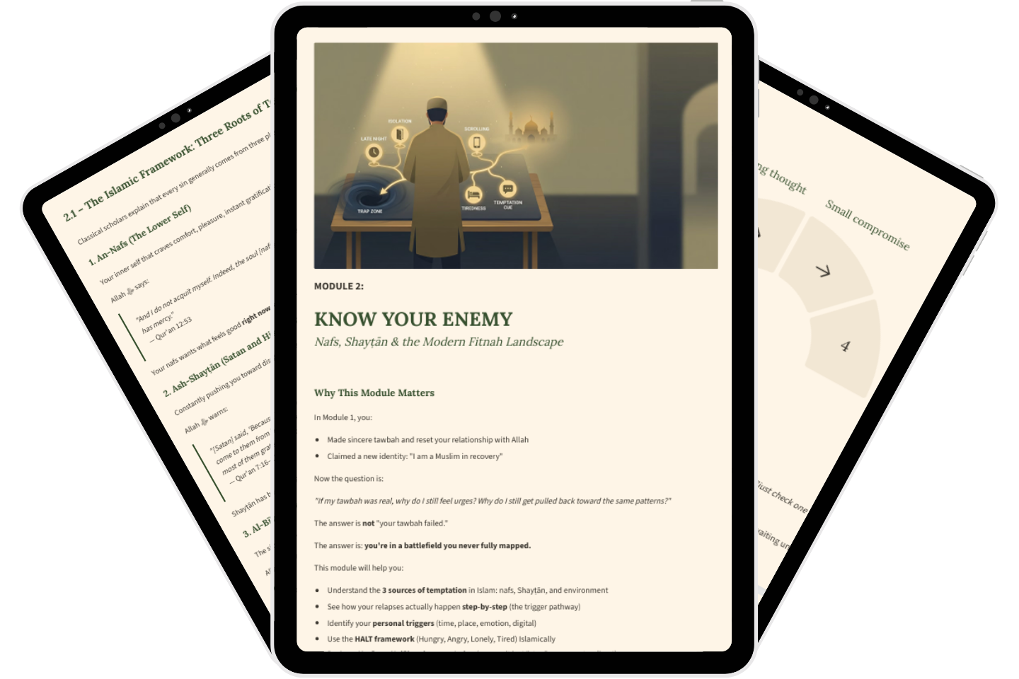 The only approach that works combines three things that have never been put together in a single structured program for Muslim men: Islamic identity transformation + behavioral environment redesign + daily neurological recalibration. Each one alone is insufficient. Together, in a structured 21-day sequence, they close the gap permanently.