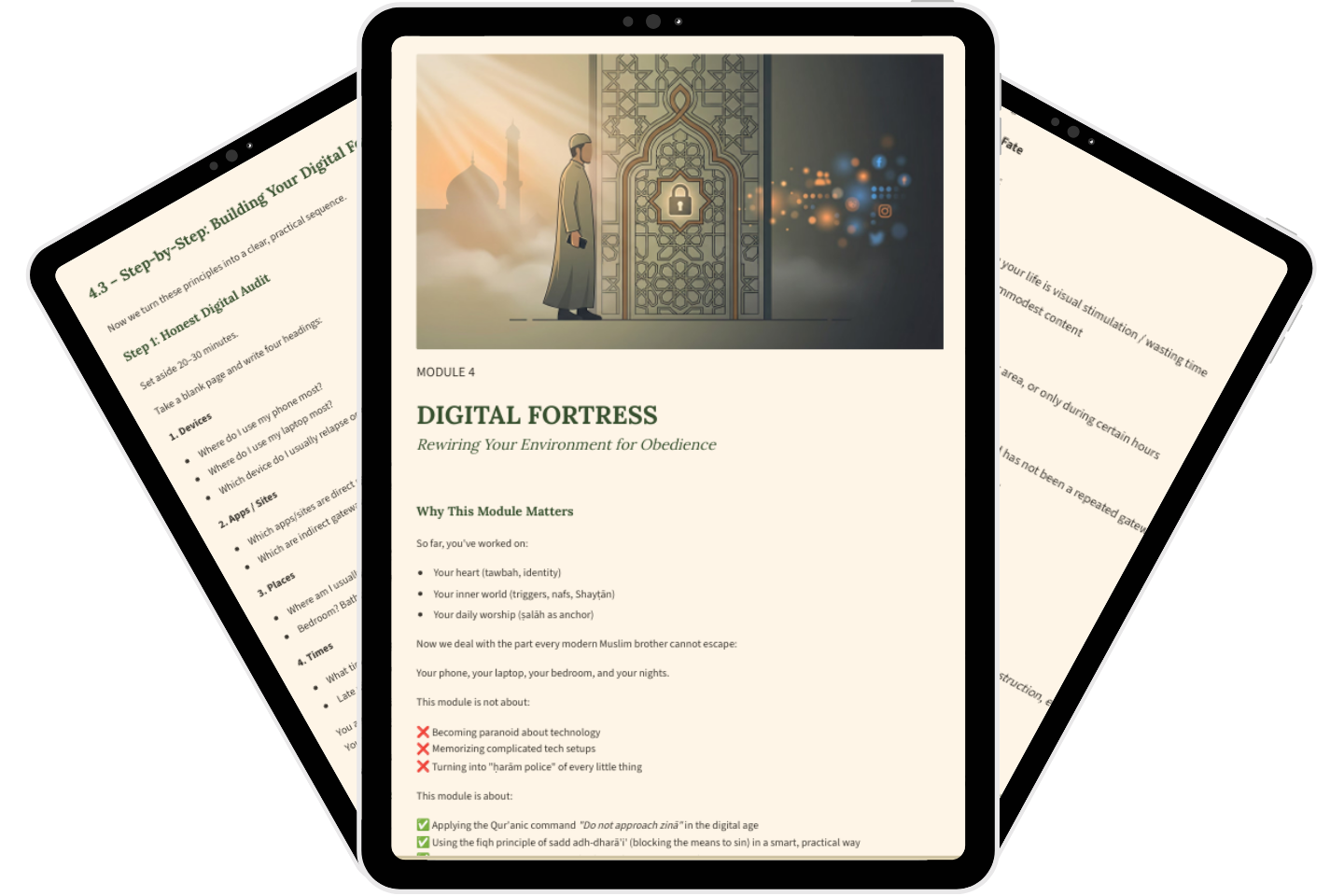 The Digital Fortress module alone is worth 10x the price. I used to think I just needed more willpower. Wrong. I needed better boundaries. Phone outside bedroom, apps deleted, night protocol in place - haram went from 3 taps away to 30+ clicks away. My environment changed, then my results changed. Day 58, alhamdulillah.