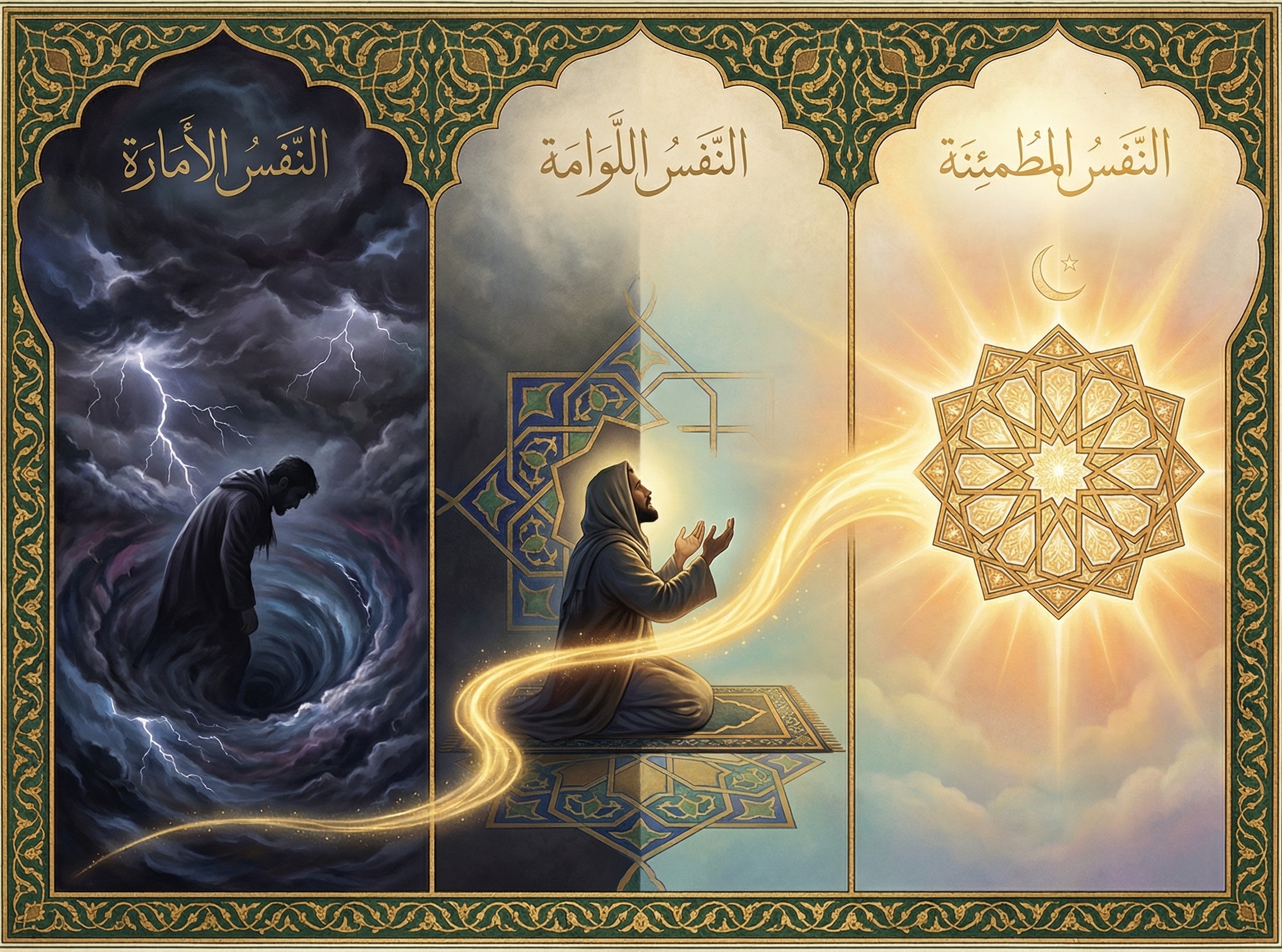 Islamic tradition has always known that the nafs - the self - moves through three stages. This is not metaphor. It is a precise psychological map that scholars have refined for 1,400 years: